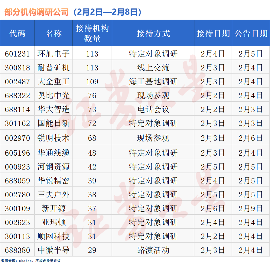 在2026年春节前夕的关键布局窗口期,机构投资者调研热情不减。根据Choice数据统计,2月2日至2月8日这一周内,近170家上市公司接待了各类机构投资者的实地走访与交流,覆盖半导体、工业自动化、新能源材料、智能制造等多个高成长性赛道,充分体现出资本对科技创新与产业升级主线)this.width=500 align=center hspace=10 vspace=10 rel=nofollow/>